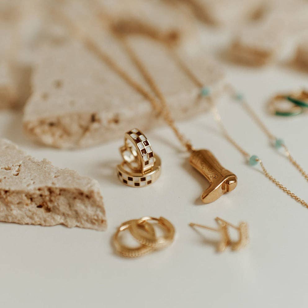 The Brown & White Checkered Hoops are made of high quality gold fill and are hypoallergenic and good for sensitive ears. They have a huggie closure style and are the cutest new jewelry trend! Outer diameter is 10mm.
